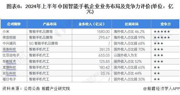 由于中国智能手机市场格局分散,业内代表企业市场份额占比均不高,结合代表企业智能手机业务发展概况,及企业业务收入、区域布局等指标对其竞争力进行评价如下: