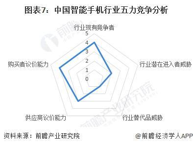 从波特五力分析模型来看,中国智能手机行业基本形成了以 " 华米 OV" 为代表的国产手机阵营和以苹果三星为代表的两大国外手机生产阵营,市场竞争较为激烈 ; 智能手机行业作为高科技行业,伴随着各种专利之争,对于新进入者很难达到。总的来说,智能手机行业潜在进入者威胁不大 ; 智能手机已经成为人们日常生活中最重要的一部分,从早到晚、各个场所都在使用,甚至成了手机不离手的现象。虽然有智能平板、智能手表等一系列智能产品出现,但目前智能手机的地位依旧无可撼动,因此行业替代品威胁较小 ; 智能手机行业的上游主要是手机芯片、内存、屏幕、电池、摄像头等零部件。其中多数零部件产品供应数量较多,分布广泛,对上游供应商议价能力较强。而最重要的芯片成为手机制造的关键受到国外企业制衡,议价能力较弱。上游整体议价能力一般 ; 目前我国智能手机行业下游核心为手机消费用户,手机行业对下游议价能力一般。