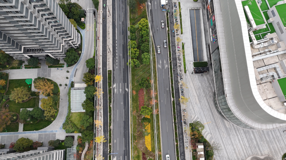 从空中俯瞰,双向六车道、全长660米的真华南路(武宁路到铜川路段)整洁有序、车水马龙。据普陀区绿化市容局相关科室介绍,真华南路的绿化建设始于2021年,其精心设计的绿化结构由中央隔离带和两侧机非隔离带组成。中央隔离带内的香樟依旧郁郁葱葱,黄色的银杏叶片、红色的枫叶在风中摇曳生姿,各种颜色交织在一起组成了一幅多彩的画卷。