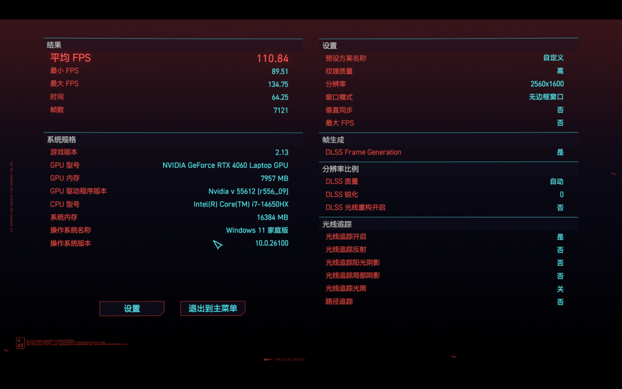 《赛博朋克2077》在2.5K分辨率、纹理质量高的设定下,平均帧率为110.84FPS,同样有着优秀的游戏体验。