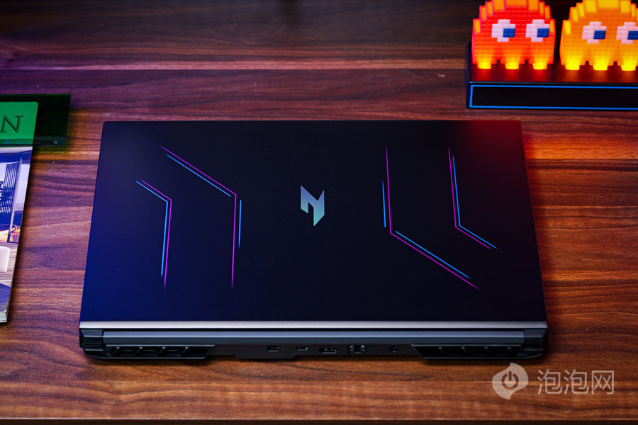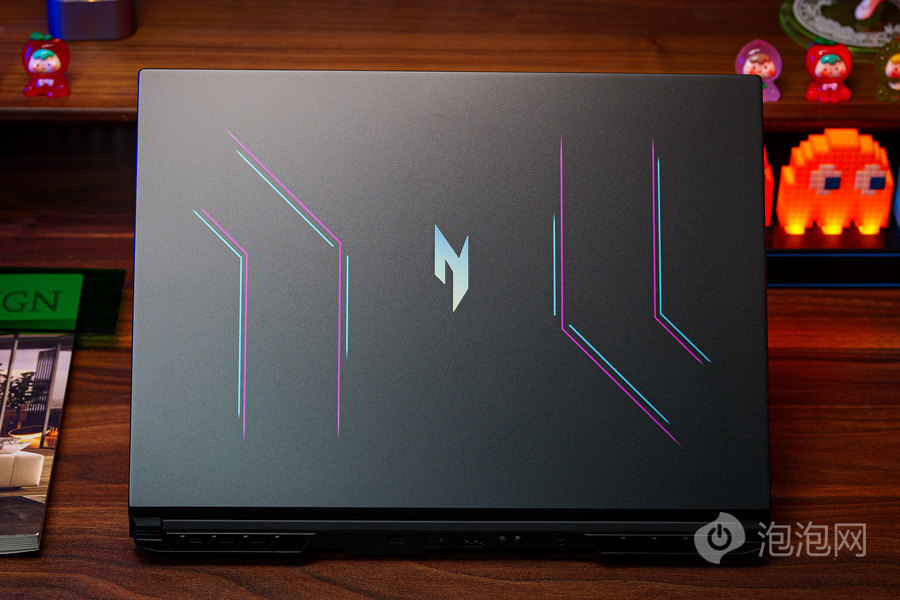 暗影骑士·擎6的外观设计非常的简约,虽然整机依然是偏硬朗的风格,但没有以往过于张扬的设计,在机身A面只有一个简单的渐变色LOGO,LOGO是由NITRO的“N”演化而来,四条彩色线条作为装饰,这种简简单单的设计就给人一种西装暴徒的感觉,看似平常,却蕴含着澎湃的性能。