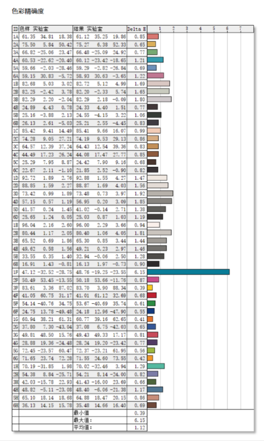 在色准方面,暗影骑士·擎6的屏幕ΔE值为1.12,除了1F的蓝色色差较大外,其余的色彩都是比较准确的,在色彩精确度上也是很不错的表现。