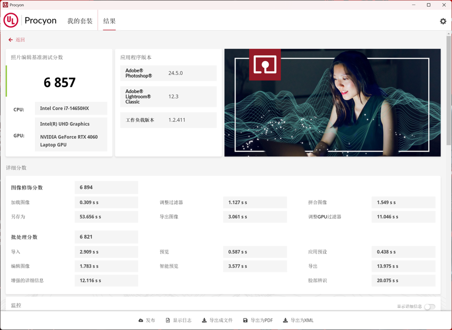 对于创作者来说,暗影骑士·擎6也会带来非常高效的创作表现。UL Procyon的照片编辑基准测试分数达到了6857分。