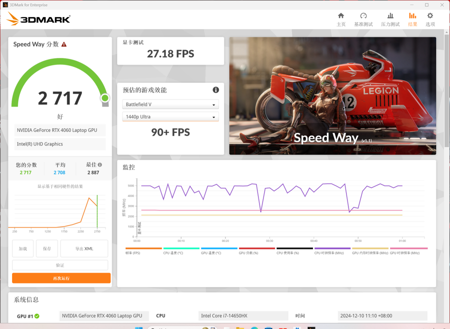 通过3DMark测试,暗影骑士·擎6的显卡的各项分数表现也非常不错,比如比较考验性能的Steel Nomad分数得到了2353分,Speed Way的分数为2717,这也代表暗影骑士·擎6具备了优秀的游戏表现。