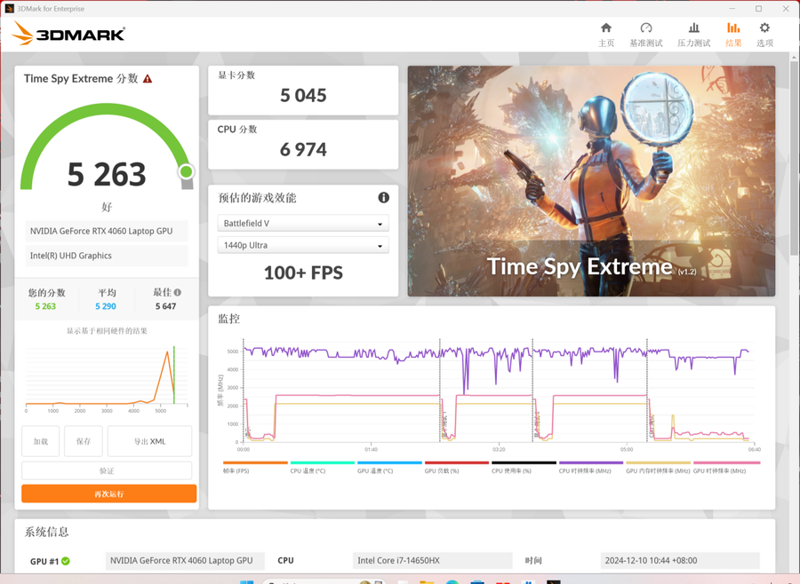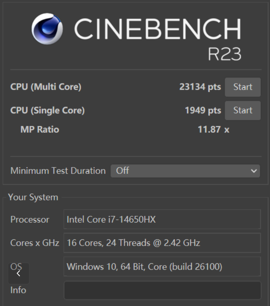 在R23的测试当中,R23的单核成绩为2599pxs,多核成绩为30845pxs。通过针对CPU的测试可以看到,暗影骑士·擎6能够很好的发挥出i7-14650HX处理器的性能,在日常办公以及游戏时提供强劲的性能支持。