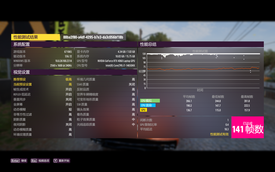 《极限竞速:地平线5》的极 高画质下,帧率达到了141帧,在具备优秀画质的情况下,帧率表现也十分出色,对于喜欢竞速的玩家来说,暗影骑士·擎6还是非常值得推荐的。