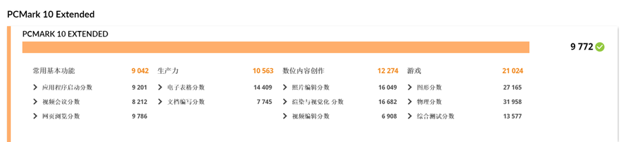 在PCMark 10 Extended测试项目中,暗影骑士·擎6的总分为9772分,在生产力以及游戏项目上的成绩都很出色。