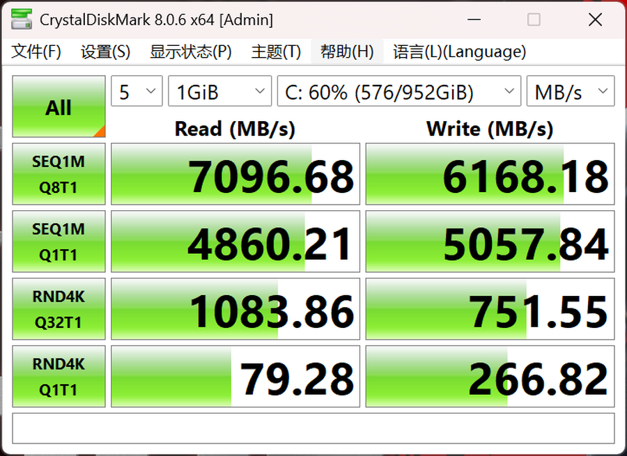 硬盘方面,暗影骑士·擎6搭载了1TB PCIe 4.0 SSD,顺序读取速度7096.68MB/s,写入6168.18MB/s;4K随机读取速度79.28MB/s,写入速度266.82MB/s,速度表现是十分出色的。而且机身内也预留了M.2接口,用户也可以自行对存储进行扩展。