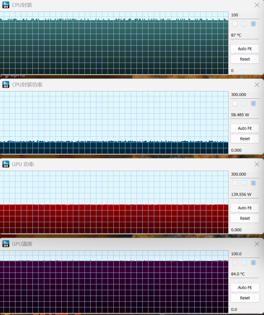 在双烤测试中,测试30分钟,CPU的温度为87℃,功耗为58W。GPU的温度为84℃,功耗为139W,在双烤时,暗影骑士·擎6的散热表现还是很不错的,可以让CPU与GPU在高性能的状态下持续的运行。
