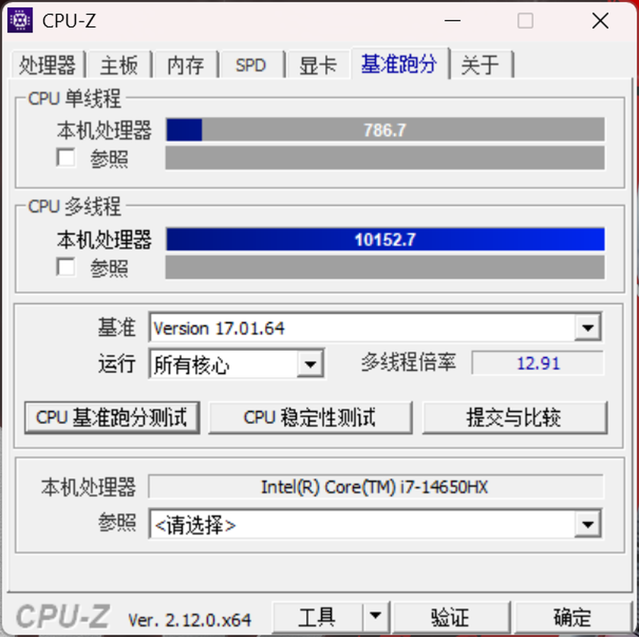 根据CPU-Z的实测,单核得分为786.7,多核成绩为10152.7。
