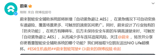 【CNMO科技消息】12月12日,据蔚来官微消息,蔚来智能安全辅助系统即将新增自动紧急避让AES,在紧急情况下可自动变换车道避险,覆盖场景更多、可触发的速度区间更广。同时,蔚来设计了行业独有的防夹功能,在前方有障碍车、后方未保持安全车距的车辆高速驶来时,可触发自动紧急避让AES,从而减少多车连环追尾风险。
