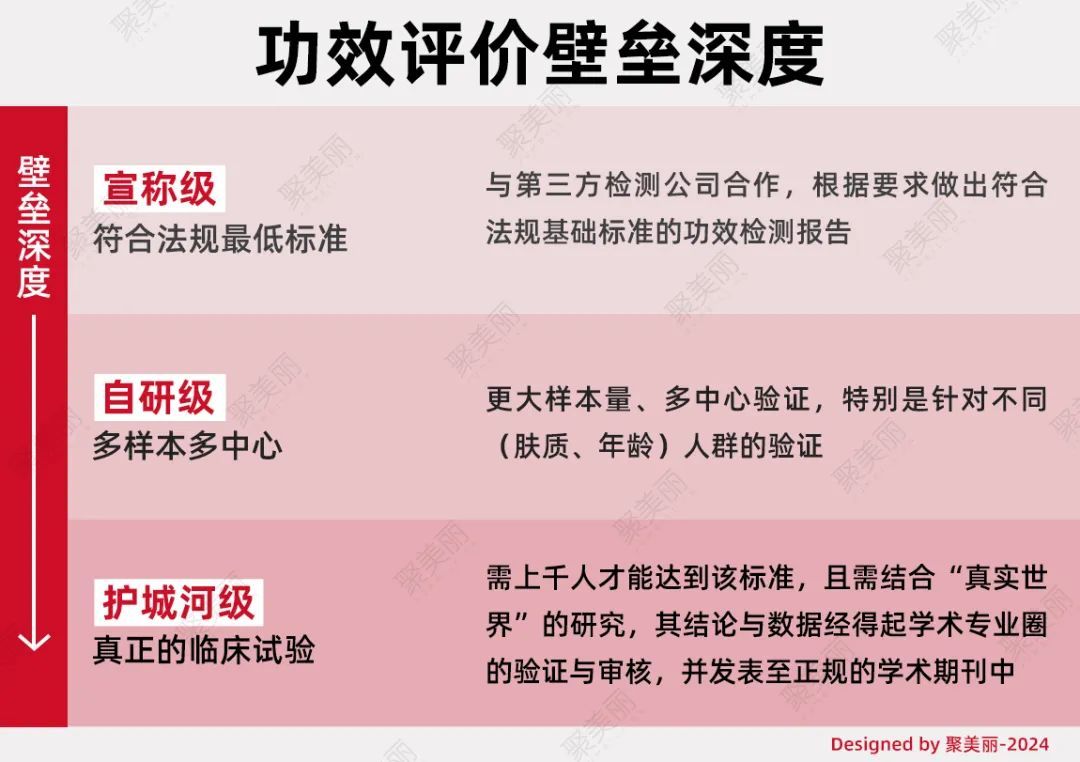 以功效评价为例,“宣称级”的品牌往往拿着功效检测报告“当令箭”,但事实上成品做了功效检测报告,只是达到了监管规定的最低标准而已;自研级的品牌,在功效检测报告的基础上,往往还会通过更大样本量、多中心验证,特别是针对不同肤质、年龄层人群的验证。