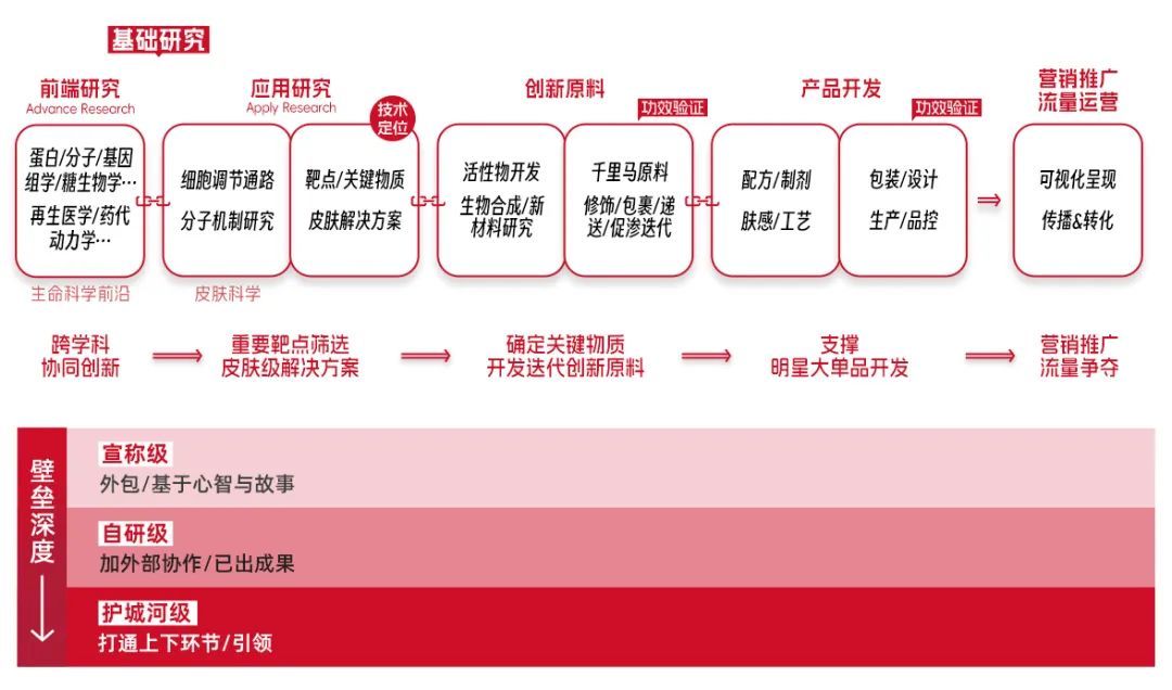 护城河级:有明晰的技术定位,并真正打通从基础研究、皮肤科学到原料创新、功效验证再到产品落地的全链路。