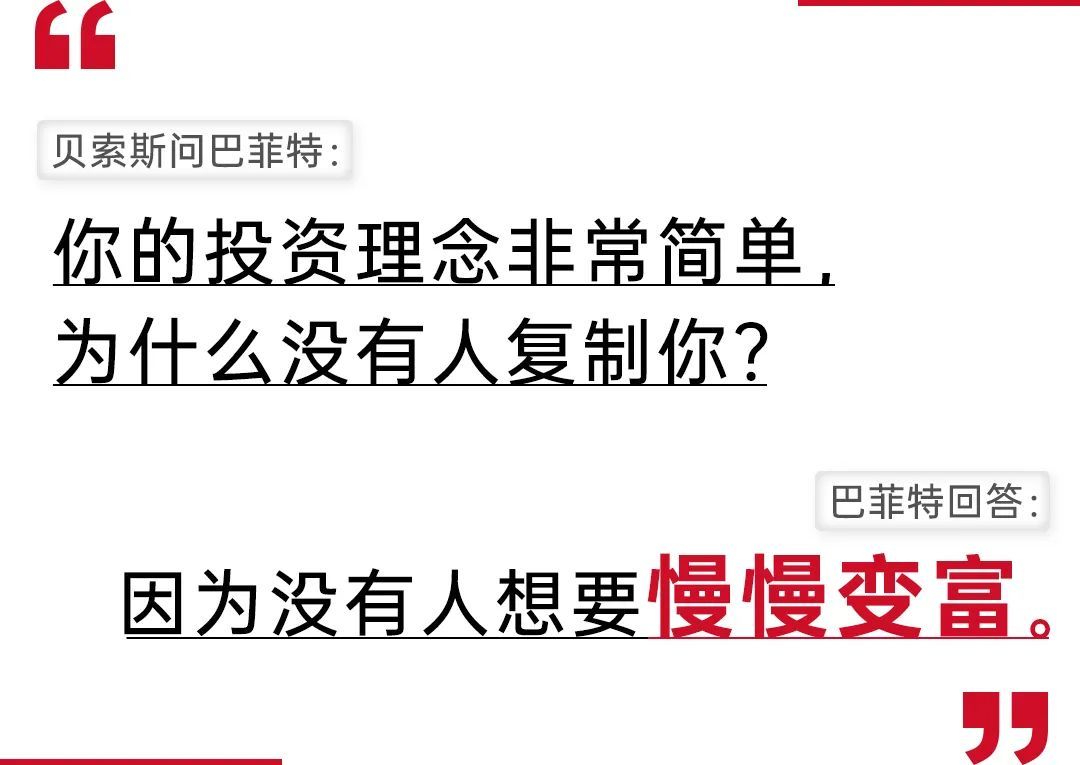 亚马逊创始人贝索斯曾与巴菲特有一个广为流传的对话,贝索斯问巴菲特:“你的投资理念非常简单,为什么没有人复制你?” 巴菲特回答:“因为没有人想要慢慢变富。” 据悉,巴菲特90%以上的财富,都是60岁后获得的。