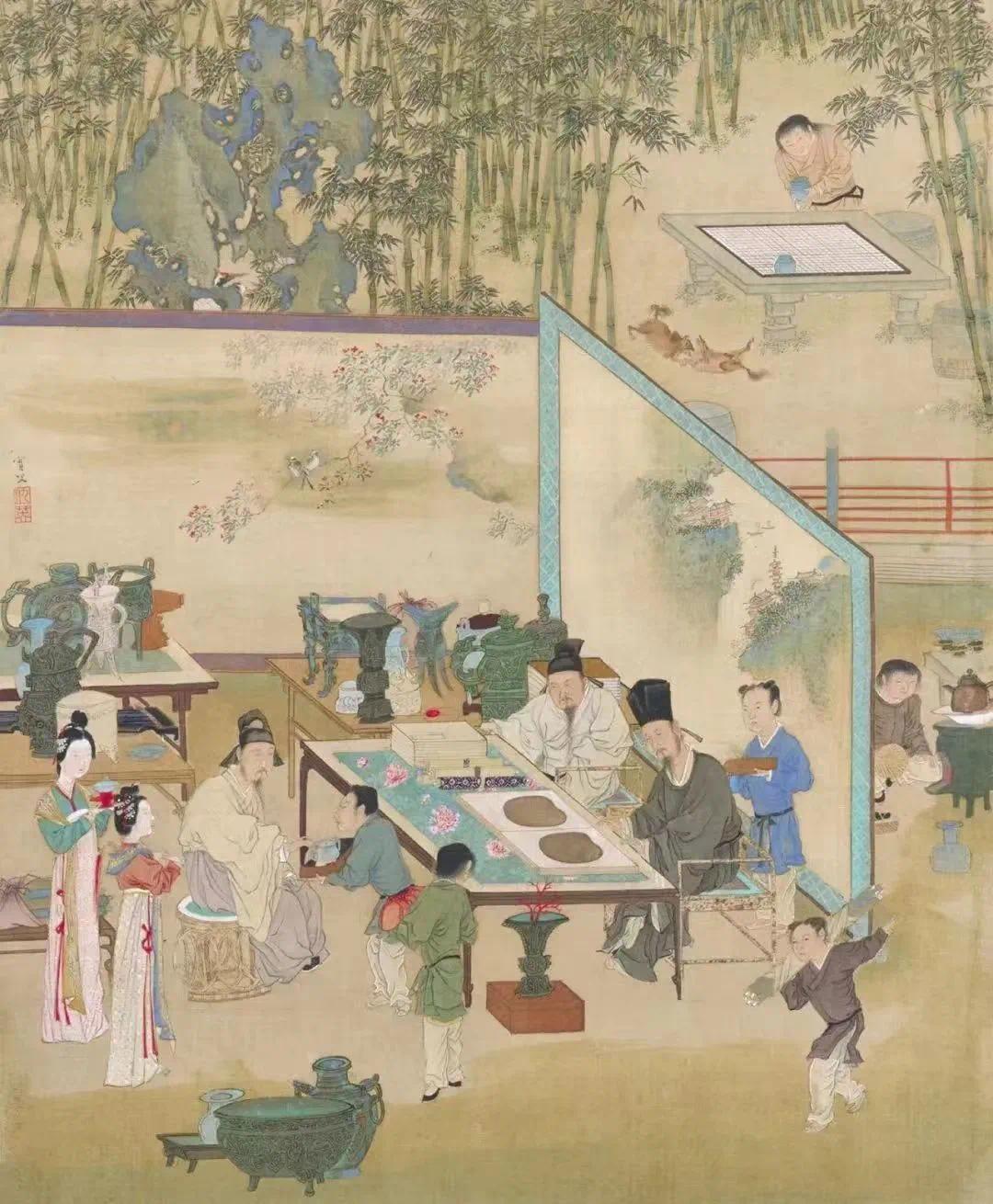 |(明)仇英《竹院品古图》中,苏东坡与友在庭院中品茶寻趣。图源:故宫博物院