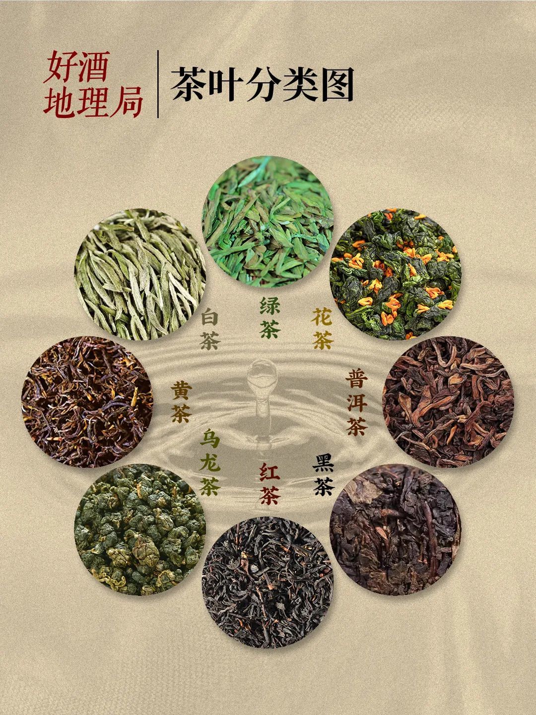 为了区分数量繁杂的茶叶种类,通常会按照茶叶的颜色和制作方式进行分类,这就形成了绿茶、白茶、黄茶、乌龙茶(青茶)、红茶、黑茶等类别,以及普洱茶、花茶等类别。