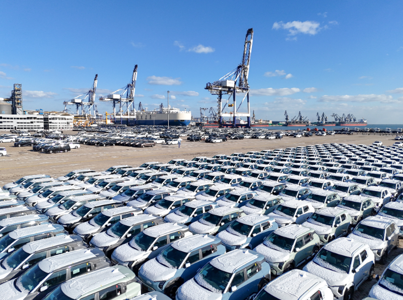 12月8日,大批商品车在山东港口烟台港等待装船(无人机照片)。新华社发(张进刚摄)