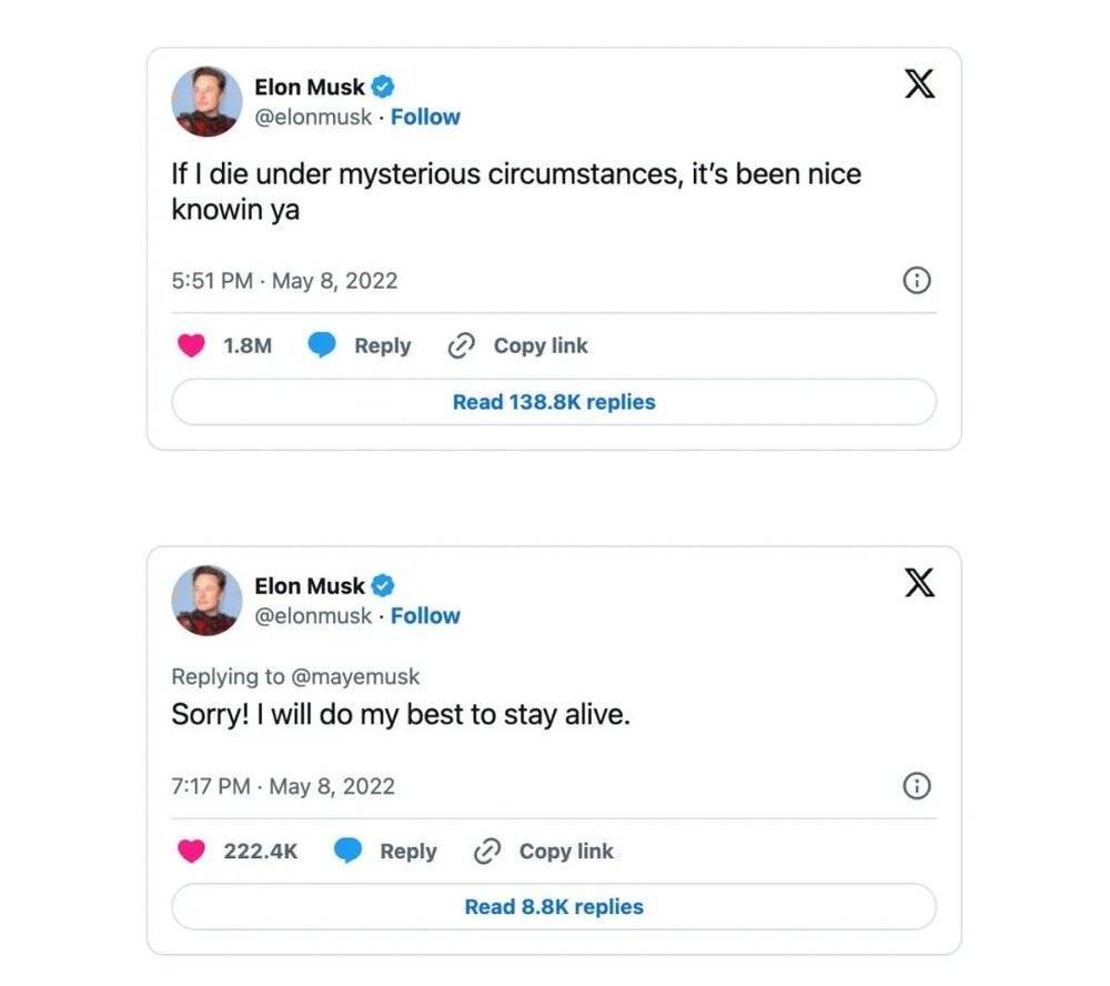 今年7月,在特朗普遭暗杀未遂事件之后,有粉丝在X平台提醒马斯克要注意安全。马斯克回复表示,“自己在过去8个月时间已经遭到两次不同的暗杀。暗杀者携带枪支在距离特斯拉德州总部20分钟车程的地方被逮捕。”