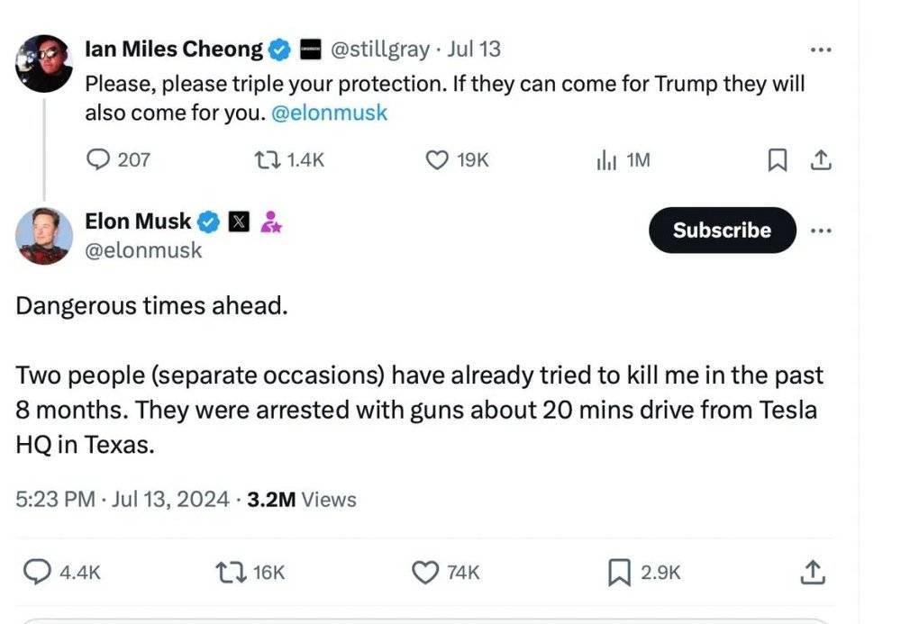 另一方面,毫不夸张地说,马斯克绝对是“最危险”的全球首富。这里的“危险”之所以标引号,指的是马斯克因为强烈的政治倾向和桀骜不驯的公开言论,引发了诸多争议,从而给自己的安全带来了切实威胁。马斯克自己就是极端狂热分子的暗杀对象。而扎克伯格至少并没有遭遇过暗杀。