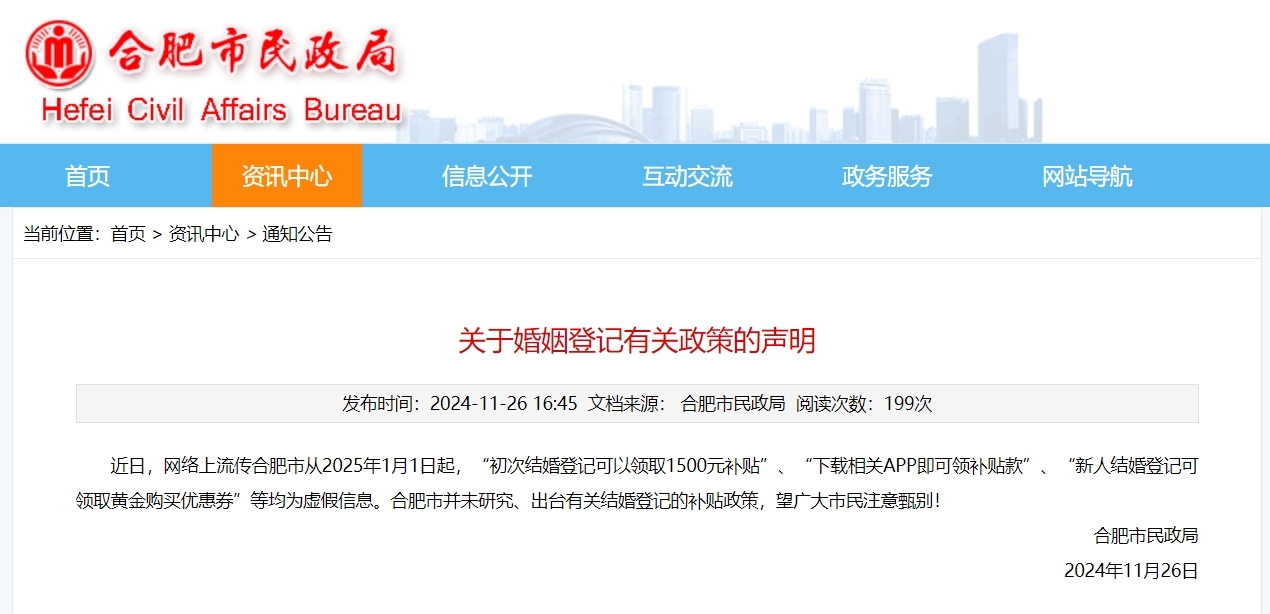 近日,网络上流传合肥市从2025年1月1日起,“初次结婚登记可以领取1500元补贴”、“下载相关APP即可领补贴款”、“新人结婚登记可领取黄金购买优惠券”等均为虚假信息。合肥市并未研究、出台有关结婚登记的补贴政策,望广大市民注意甄别!