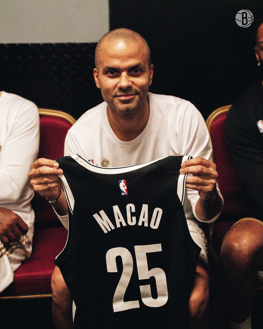 篮网队官方晒出马刺队名宿托尼-帕克展示篮网队“澳门”纪念款球衣的照片,球衣号码为25号(2025年),上方印着中国澳门的英文Macao,并配文:托尼-帕克邀请大家2025年十月一起来澳门看中国赛!