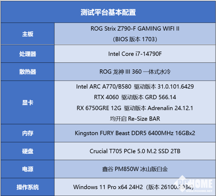 测试平台方面,考虑到目前锐炫B580的定位,我们选择了英特尔酷睿i7-14790F处理器,主板采用ROG Strix Z790-F GAMING WIFI II主板,散热器为ROG龙神III 360一体式水冷;内存采用Kingston FURY Beast DDR5 6400MHz 32GB套条;硬盘采用Crucial T705 PCIe 5.0 2TB固态硬盘;供电采用鑫谷PM850W冰山版白金电源。操作系统采用Windows 11 Pro x64(版本24H2. 26100.2034),除锐炫B580使用内测版驱动外,其他硬件均使用厂商官方公版驱动程序。