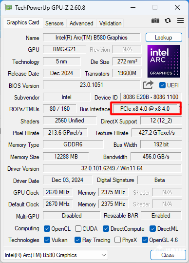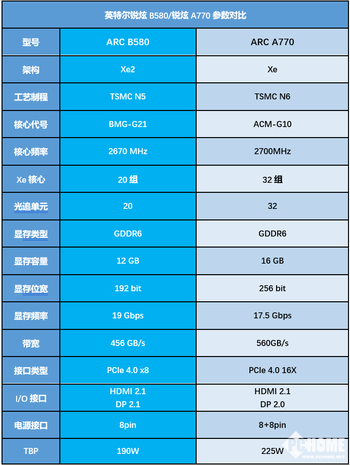 全新的锐炫B580显卡采用BGM-G21 GPU,制程工艺升级到TSMC N5,拥有5组渲染切片,20个Xe核心。基于Xe2新架构的GPU,Xe核心的性能较上代提升了70%,能耗比则提升了50%。Arc B580显卡配备192bit 12GB GDDR6显存,显存频率19Gbps,基础频率为2670MHz,最高频率为2850MHz。