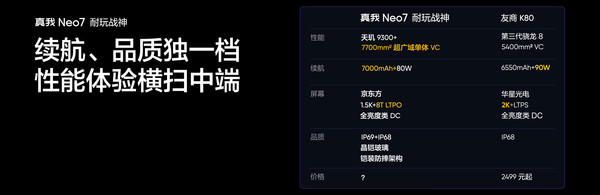 价格上,真我Neo7售价2099元起,性价比极高。REDMI K80售价2499元起,虽然价格稍高,但也在合理范围内。