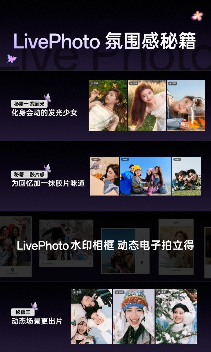 OPPO Reno13系列还将柔光镜带到 LivePhoto,支持柔光实况照片;带来了胶片拍照的色彩,还原胶片风格照片,支持胶片风格实况照片;水印相框实况照片让照片满满氛围感,拥有独家的个性化水印相框。