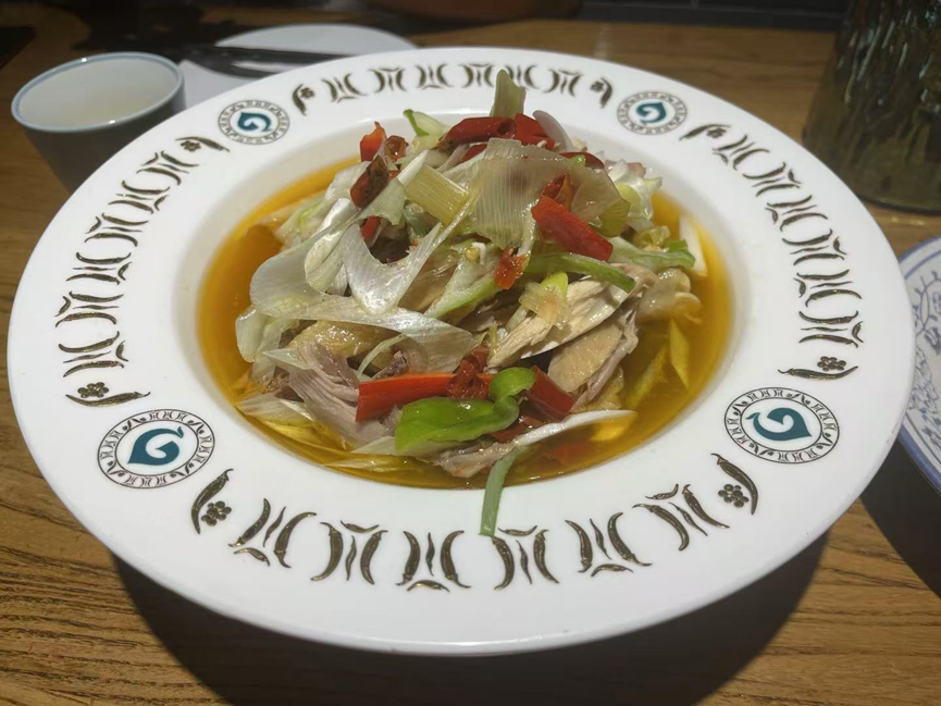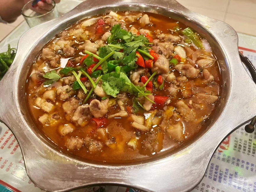 其实,新疆不仅有许多川菜馆,很多当地的新疆“特色菜”,背后都有浓厚的川菜影子。譬如我们到乌鲁木齐第一晚,就去吃了一家椒麻鸡。椒麻鸡原是川菜,传入新疆之后加入线椒、洋葱等当地风物,麻味稍减,整体味道更为清爽。