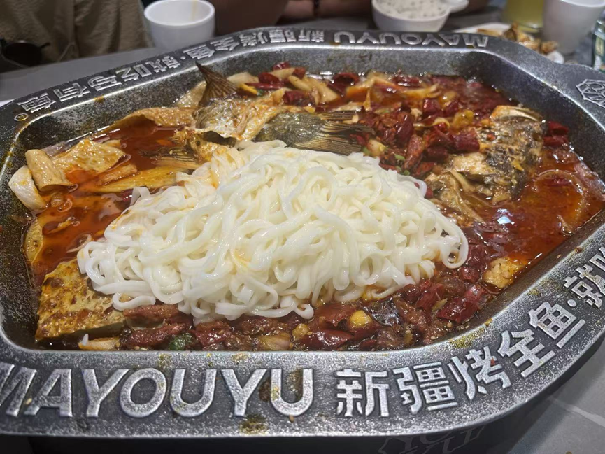 在克拉玛依,我们去了一家叫“马有鱼”的烤鱼店,说是新疆特色的“馕坑烤全鱼”,但实际上和在巴蜀地区流行的烤鱼,区别也不大。