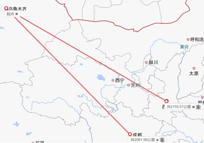 虽然空中航路不能完全走直线,乌鲁木齐到西安的航路时间比到成都短半个小时左右,但作为接近3个小时的长程航班,这种差别其实也不显著了。