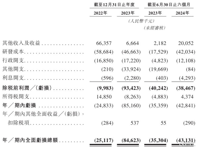 2022年、2023年以及2024年1-6月,公司的全面亏损总额分别为2511万元、8462万元、4313万元,亏损主要来自研发成本及行政开支;其中,研发成本达到5868万元、4666万元、4203万元。