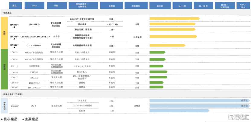 自2016年起,公司一直打造创新管线,已开发由共10种候选药物组成的管线,包括核心产品HX009及两种主要产品HX044及HX301,其中有八种针对肿瘤学的候选药物及两种针对自身免疫疾病的候选药物。