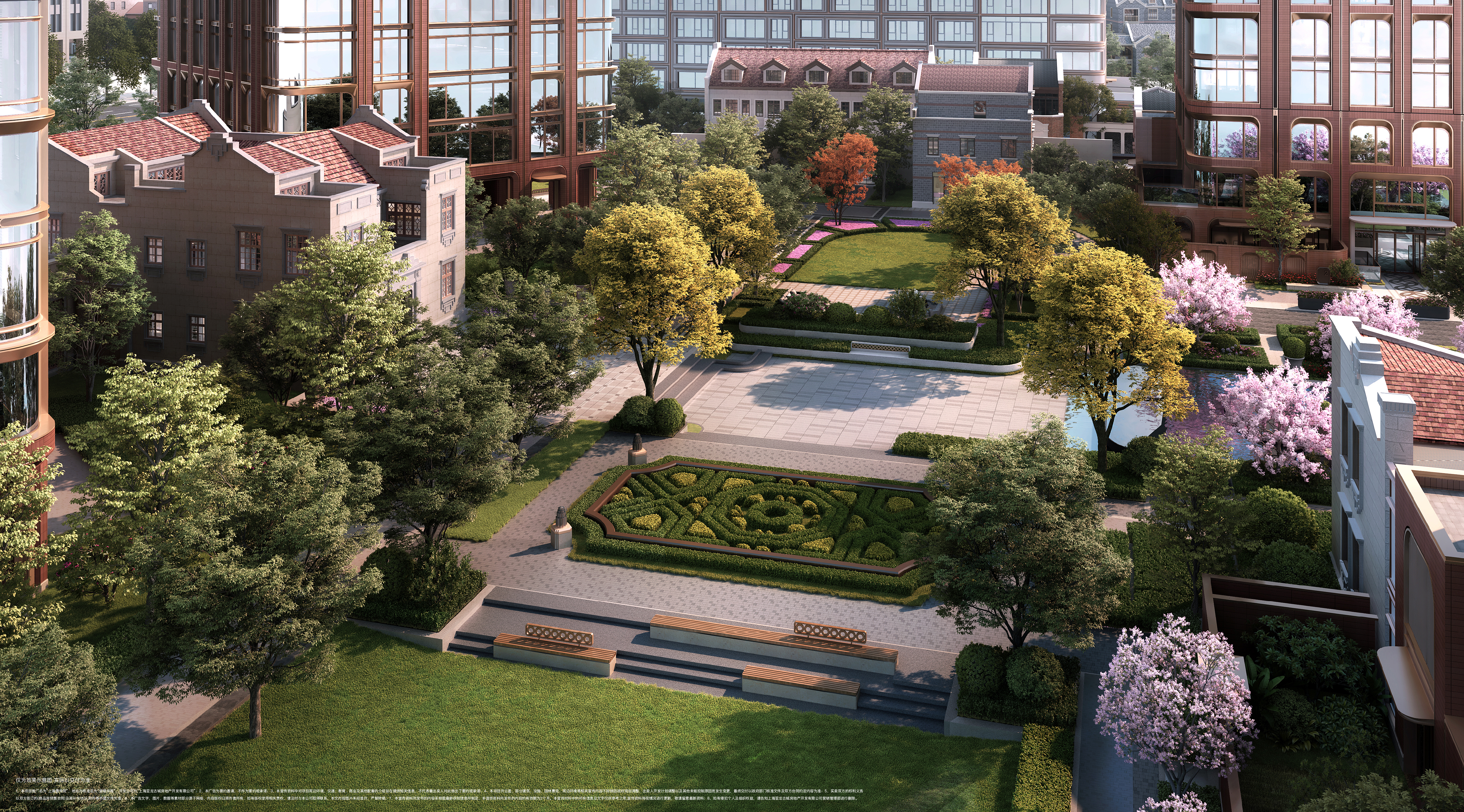 更为难得的是,社区内部打造了约1.8万方的海派公园, 以十字中央景观轴线,营造仪式感,在约95米的南北轴线和约60米的东西轴线上,精心布置八边形聚宝盆水景、焦点水景、草坪水珐、法式模纹花坛……