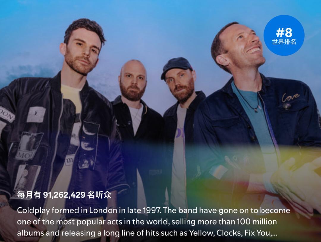 在时代巡演票房率先突破10美元之后,酷玩乐队(Coldplay)的“天体之音巡演”也突破了10亿美元,创下了乐队巡演票房的新纪录,巡演的周边产品收入据称也已经超过3亿美元。在巡演过程中,乐队的流量不断水涨船高,目前稳定跻身Spotify月度听众量世界前十,在乐队中遥遥领先。