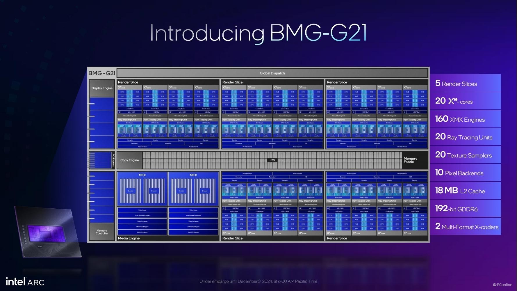 废话就说到这,一起来看看Battlemage的“新”在哪。这就不得不提B580的核心——BMG-G21,它包含了5个渲染切片以及2组MFX,即英特尔一直引以为傲的媒体引擎。