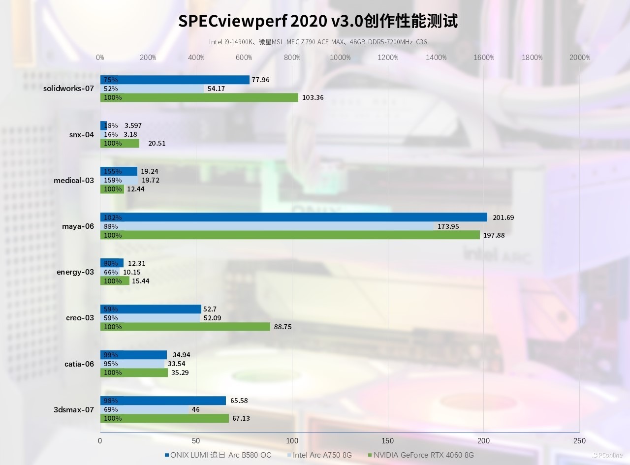 最后来看看业内喜闻乐见,生产力基准的代表软件——SPECviewperf 2020 v3.0的测试情况。在测试的8个生产力软件中,ONIX追日B580 OC与RTX4060互有胜负,这种结果对比不同架构的显卡时很常见,因为不同的研发厂商对不同算法的侧重点不一样,如果这里面有大伙常用的生产力软件的话,这个结果可以参考一下。