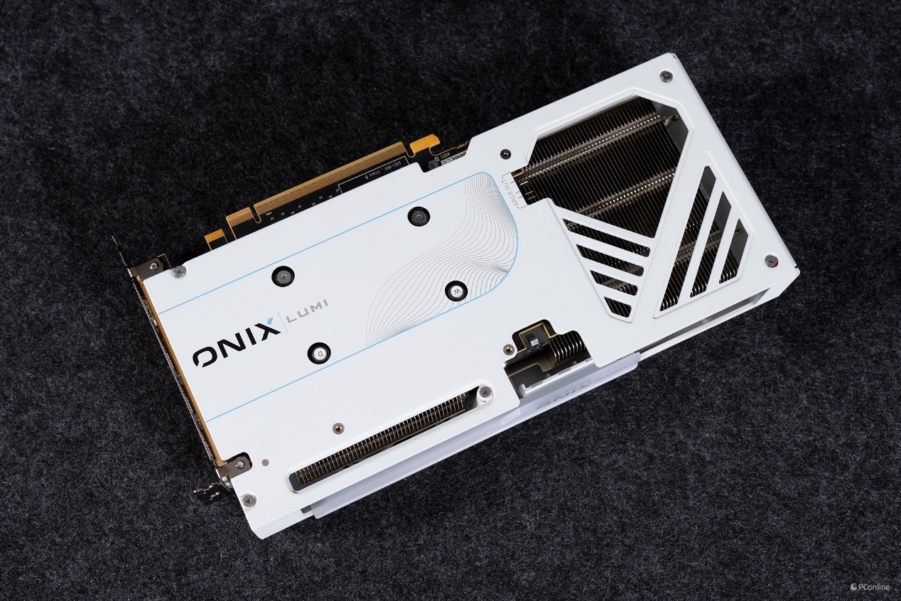 显卡的背板上同样印有ONIX | LUMI的字样,背板中央有多层曲线的视觉设计,背板末端则是镂空图案,一般来说这样更利于显卡散热。