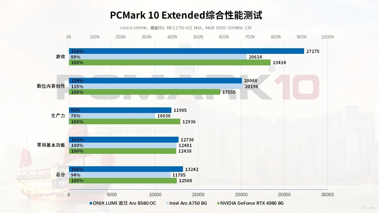 接着是PCMark 10 Extended的性能表现,这是一个更倾向CPU性能的项目,所以实测的三张显卡的总评方面得分差异只有5%左右,比较出乎我意料的是,ONIX追日B580 OC在更倾向GPU性能的游戏细分项上,对比RTX 4060有16%的领先优势,说明这个卡的底子确实不容小觑啊。