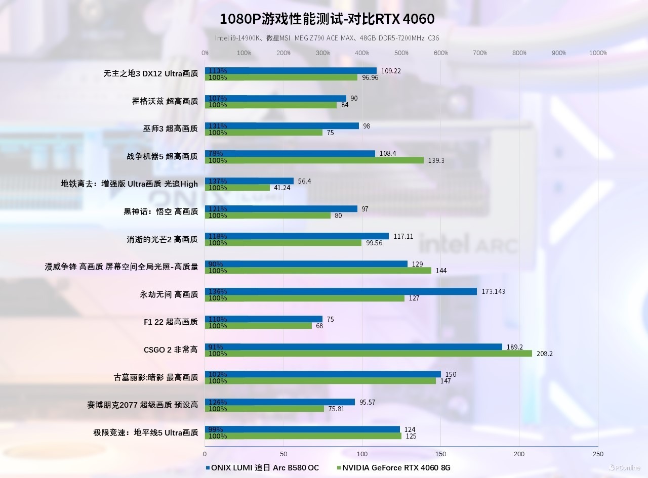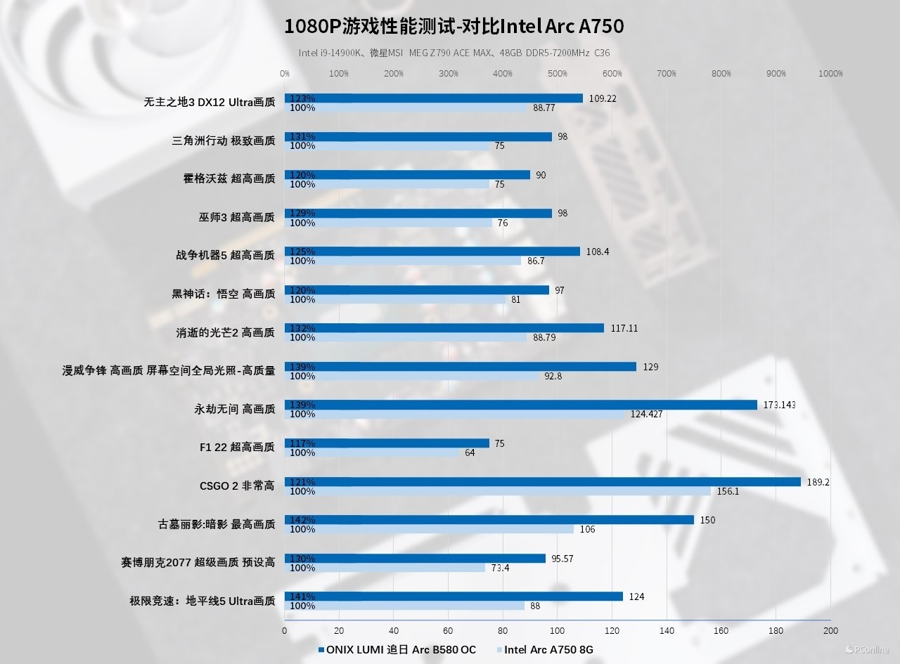 再看看ONIX追日B580 OC与A750的对比,这直观地呈现了两代Arc显卡在游戏性能上的进步幅度。1080P分辨率下,实测的14款游戏结果呈一边倒,ONIX追日B580 OC的帧率比A750高17%~42%。