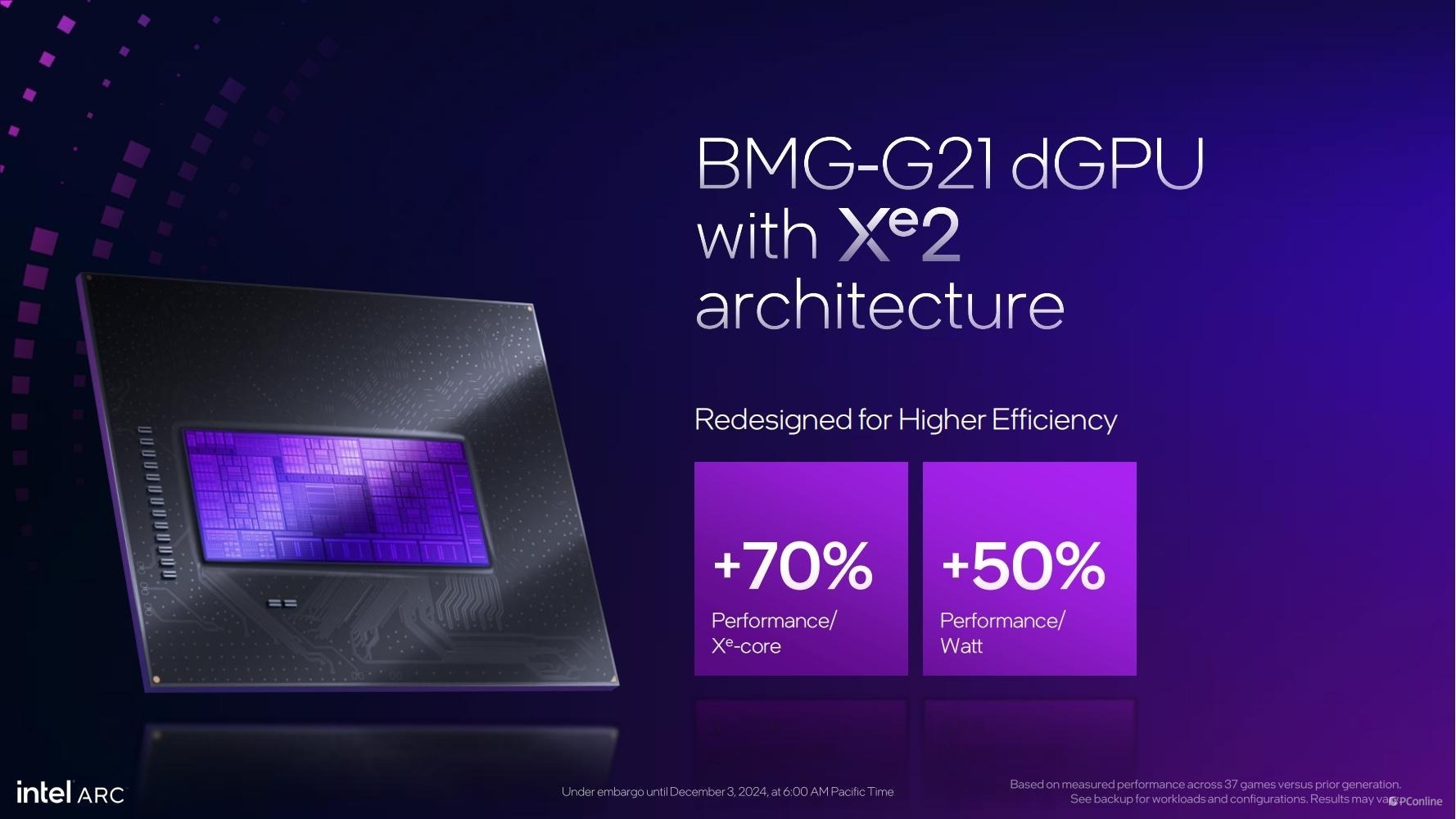 英特尔表示,基于Xe2核心打造的BMG-G21,比上一代Xe核心的GPU提升了70%的性能,并且每瓦特性能提升了50%。