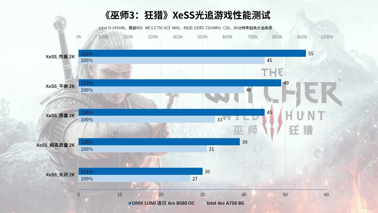 接着看看硬件要求更高的重制版《巫师3》,在咱们实测过程中XeSS技术对帧率的影响十分显著,2K分辨率+光追的画质设置已经将ONIX追日B580 OC 12GB和A750的性能完全榨干,即便开启XeSS性能档,平均帧率依然未能过60FPS,不过ONIX追日B580 OC 12GB的平均帧55FPS,对于一款RPG游戏来说已经能玩下去了,稍微降画面设置就能流畅游玩。