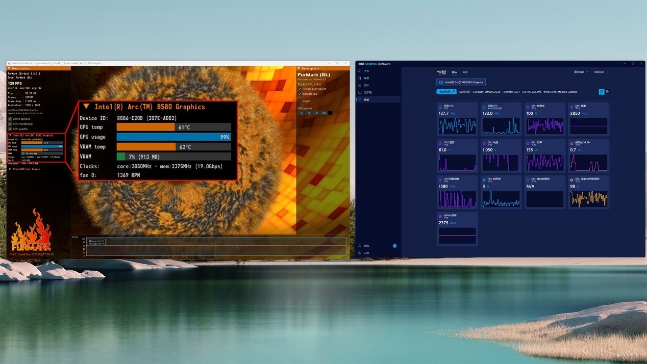 我们评价一款非公版做得是否足够优秀,除了做工用料外,更要考验它的散热能力,使用Furmark2对ONIX追日B580 OC进行30分钟烤机实测,在开放式机箱的散热环境下,显卡频率稳定2850MHz,核心温度稳定61℃。