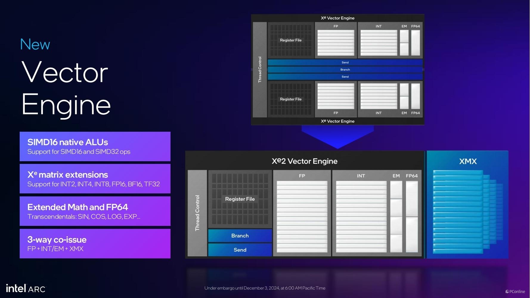 每个Xe2核心则具备了8个512位矢量引擎和8个2048位矩阵引擎,L1共享缓存高达256KB。
