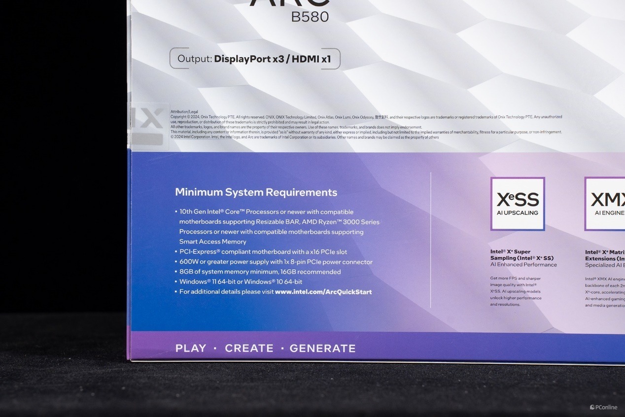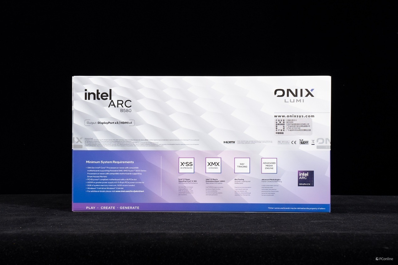 循例先看看显卡的包装,作为独显新人,这张ONIX显卡的包装中规中矩,包装盒正面铺开了所有关键信息,包括intel Arc显卡的重要特性——XeSS和XMX。