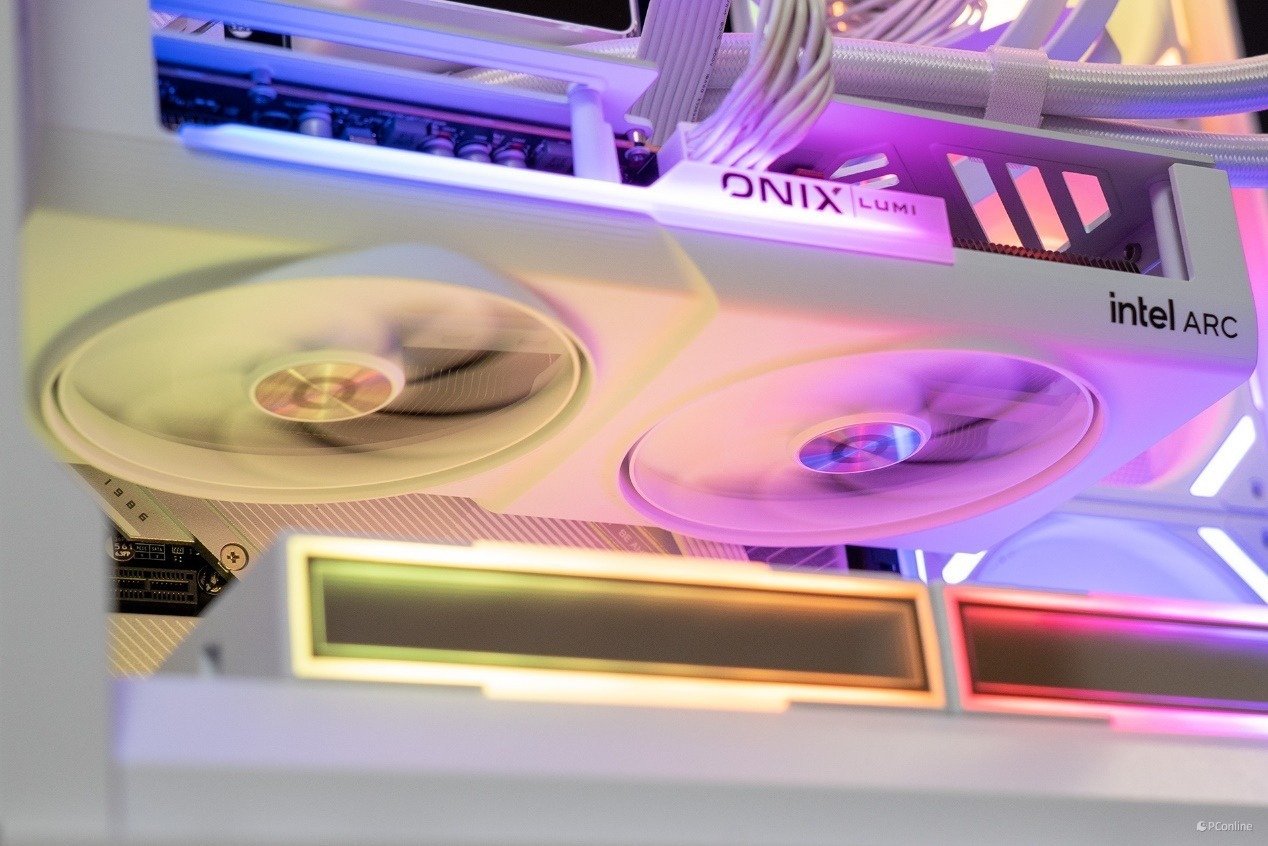 再说回ONIX追日B580 OC这个非公版本身,首先要点赞做工,做工和设计语言的处理成熟得不像一个“新势力”品牌。在保证外观颜值和做工规整的同时,它还有不错的散热能力,双风扇的尺寸对多数机箱有良好的兼容性,加之相对少见的全白配色以及首批带ARGB的B580双重特征在颜值方面有先天优势。能把做工、设计、用料、实用性三者做到合理均衡,ONIX的产品团队颇具大厂作风。