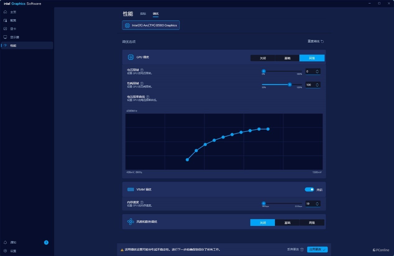 对于硬件玩家来说,则可以通过【性能】菜单下的【调优】选项对GPU的运行频率、功率、电压频率曲线、显存、散热等详细参数进行图形化调整,折腾显卡的玩法一下子就丰富了起来。