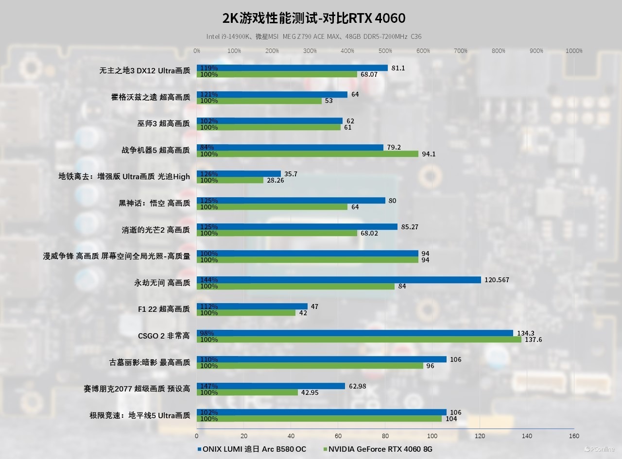 有点出乎我们意料的是,在2K分辨率下,ONIX追日B580 OC 12GB并没有扩大领先幅度,撇开《巫师3》这个特例,它对比A750的帧率领先幅度在15%~40%,表现大致对应1080P分辨率。不过这已经相当了不起,再次重申,ONIX追日B580 OC对比A750属于越级挑战。