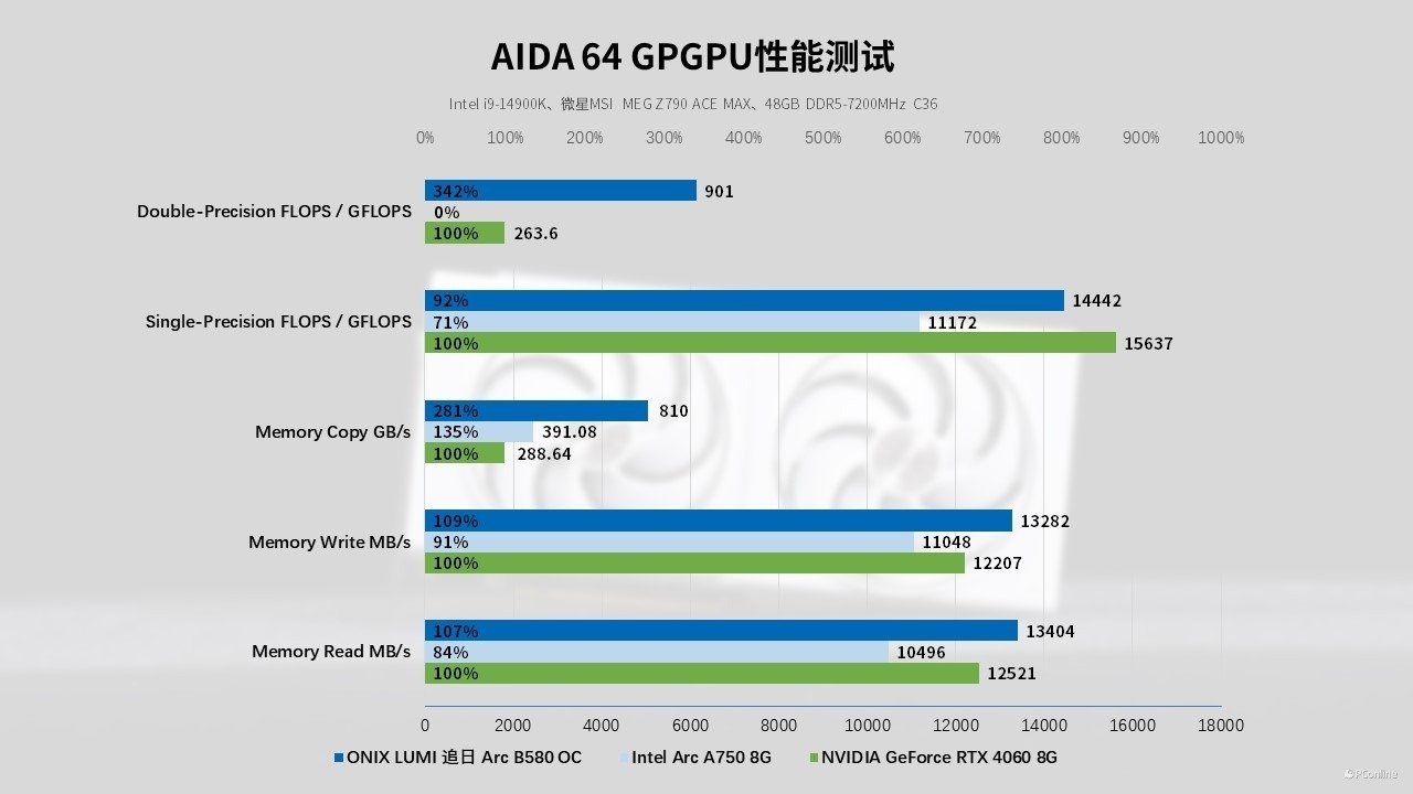 最后看看AIDA 64的通用图形处理器性能,首先经过迭代后,双精度浮点性能终于可以成功运行了,而且出来的成绩相较友商产品十分喜人。因为测试的三张卡均为GDDR6显存,所以显存的读写速度差异不大,都在10%以内,但Copy性能方面,ONIX追日B580 OC的表现十分拔尖,大幅领先A750和RTX 4060。
